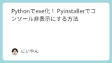 簡単に言うと、 **PyInstaller は Python のプログラムを .exe ファイルに変換して実行できるようにするツール** です。 つまり、Python をインストールしていない Windows ユーザーでも、あなたの作った Python プログラムを実行できるようになります。