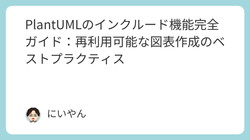 !endsubstyles/ – スタイル定義ファイルcomponents/ – 再利用可能なコンポーネントthemes/ – テーマ関連の設定common/ – 共通の設定や定義.iuml 拡張子を使用PlantUMLのインクルード機能は、図表作成の効率を大幅に向上させる強力なツールです。共通のスタイル定義、再利用可能なコンポーネント、条件付きインクルードなどを活用することで、保守性の高い一貫性のある図表を作成できます。適切なディレクトリ構造と命名規則を採用し、インクルード機能を効果的に活用することで、より効率的な図表作成ワークフローを実現できます。