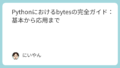 bytes型とbytearray型は、Pythonでバイナリデータを扱う上で非常に強力なツールです。bytes型は不変で読み取り専用のデータに適しており、bytearray型は可変で動的な操作が必要なデータに適しています。用途に応じて適切な型を選択することで、効率的なバイナリデータ処理が可能になります。ネットワーク通信、ファイル操作、暗号化など、様々な場面でこれらの型を活用することで、より柔軟で効果的なプログラミングが実現できるでしょう。