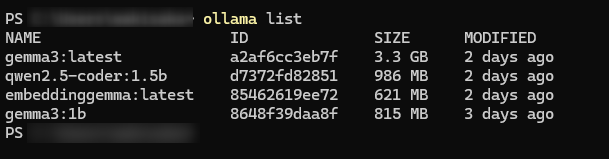 ollama pull gemma3:latest ollama pull qwen2.5-coder:1.5b ollama pull embeddinggemma:latest