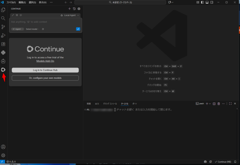 - インストール後、サイドバーにContinueアイコンが表示されれば完了。