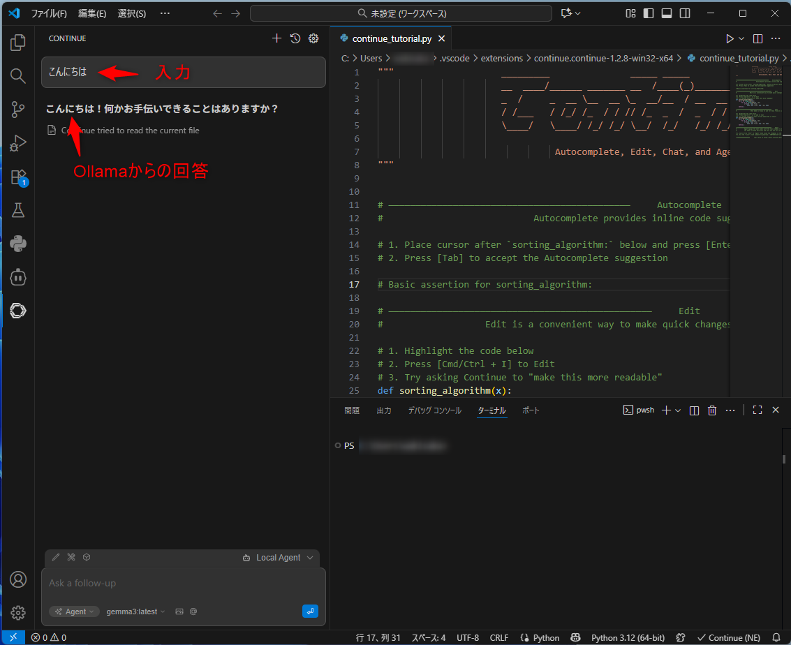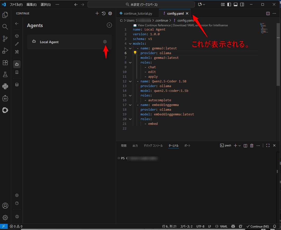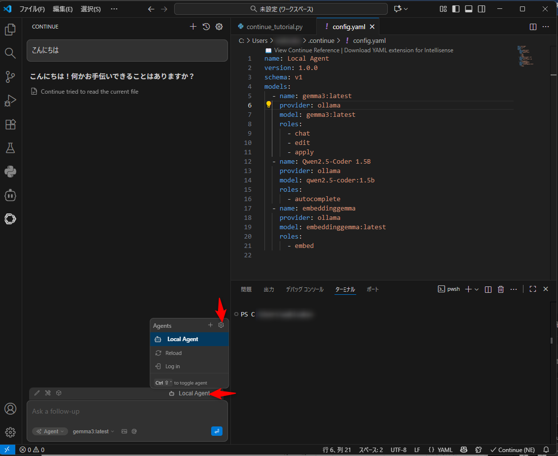 今回の設定で、VSCodeのContinue拡張はOllamaの複数モデル(会話用・補完用・埋め込み用)を有効活用できる環境が構築されます。