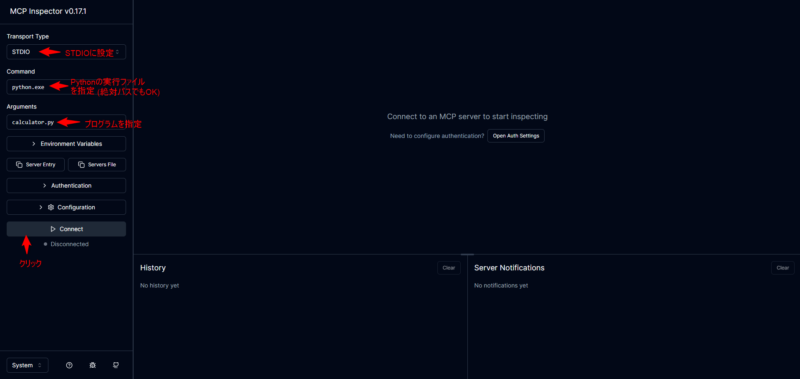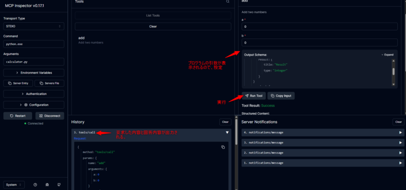 ※venvの仮想環境で動かす場合、npx @modelcontextprotocol/inspectorを実行したフォルダにプログラムを格納してください。