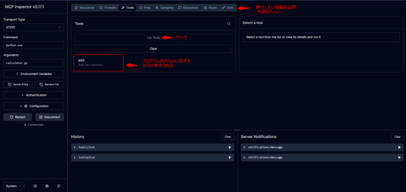 • 「Tools」「Resources」「Prompts」タブで各機能を選択
