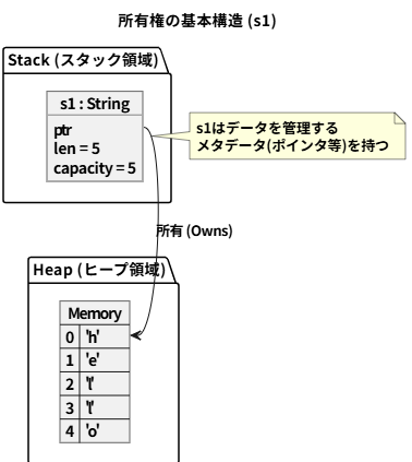 2 | let s1 = String::from("hello"); // s1が"hello"の所有者