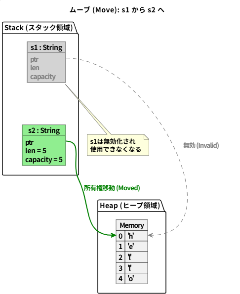 Rustでは、s1 のような String 型の値を別の変数 s2 に代入すると、s1 が持っていた「所有権」が s2 に移動します。これにより、s1 はもうその値を「所有」していない状態になるため、以降 s1 を使おうとするとコンパイラに怒られるのです。