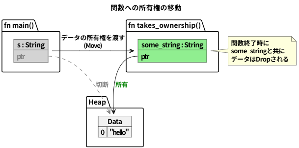 }このように、Rustの所有権システムは、関数呼び出しのたびに値の所有権の移動を強制します。これにより、メモリのライフサイクルがコンパイル時に明確になり、実行時のメモリ管理のオーバーヘッドをなくしているのです。