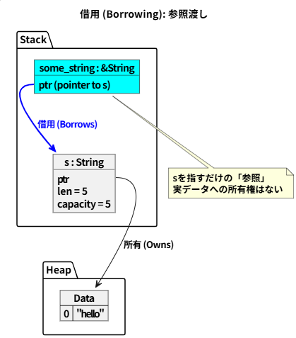 - ムーブ: Stringのようなヒープデータは、代入や関数渡しで所有権が移動し、元の変数は使えなくなる。これにより二重解放を防ぐ。