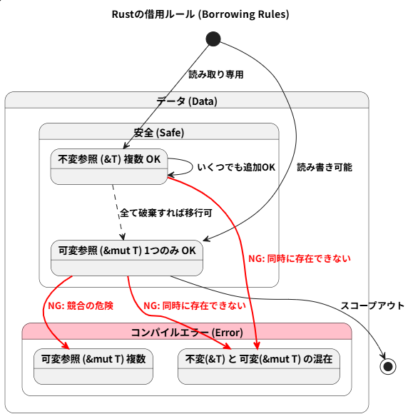 - 借用ルール: データ競合を防ぐため、「不変参照は複数OK」「可変参照は一つだけ」「不変参照と可変参照は排他的」というルールが適用される。