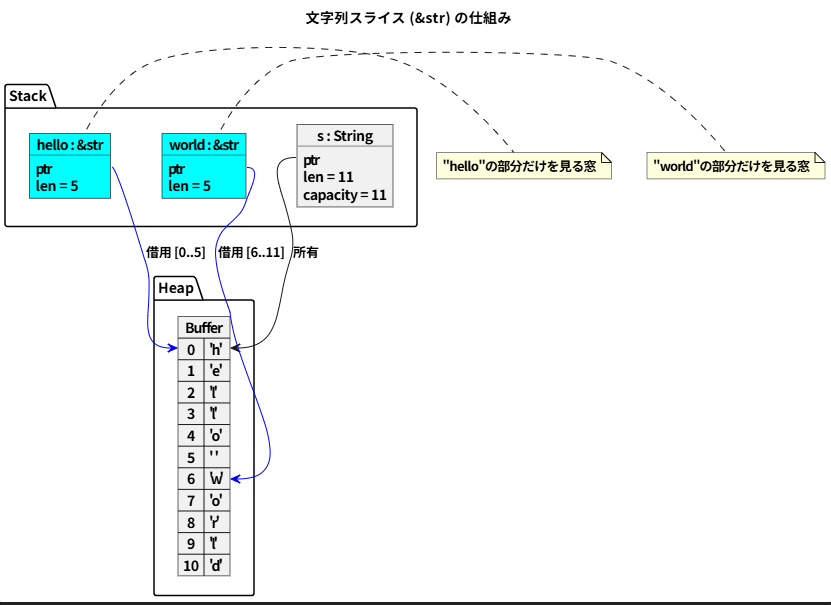 - &str (文字列スライス): 文字列リテラルや String の一部を指す不変参照。
