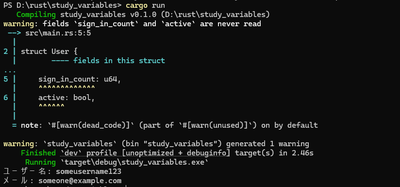 println!("ユーザー名: {}", user1.username);