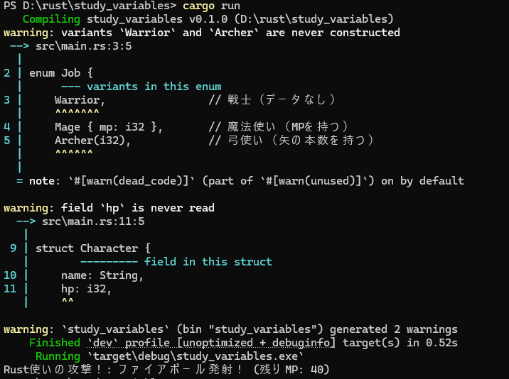 ここまでの知識(構造体、Enum、match)を組み合わせて、簡単なRPGのようなコードを書いてみましょう。