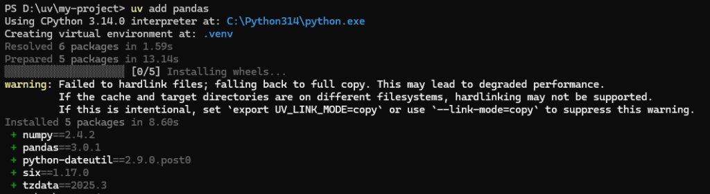 uv add pandas自動的に仮想環境(.venv)が作られ、ライブラリが爆速でインストールされます。