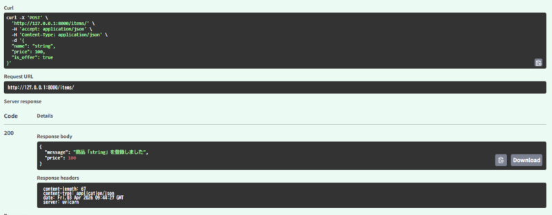 return {"message": f"商品「{item.name}」を登録しました", "price": item.price}自動バリデーションの威力