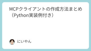 AI MCPクライアントの作成方法まとめ(Python実装例付き) MCPクライアントの作成方法を初心者向けに解説。Pythonによる実装例やローカルLLM(Ollama)との連携、開発のポイントまで、実践的なノウハウを分かりやすくまとめています。 2025.06.23 2025.11.30 AIPythonプログラム技術