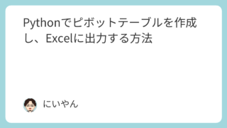 Python Pythonでピボットテーブルを作成し、Excelに出力する方法 Pythonでピボットテーブルを作成し、Excelファイルに自動出力する方法を初心者にもわかりやすく解説。Pandasや専用ライブラリを使った実践的なサンプルコード付きで、データ集計・分析業務の効率化をサポートします。 2025.06.25 2025.11.30 Pythonプログラム技術