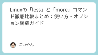 linux Linuxの「less」と「more」コマンド徹底比較まとめ:使い方・オプション網羅ガイド Linuxのlessコマンドとmoreコマンドの違いや使い方、主要オプションを網羅的に解説。両コマンドの特徴や実践例まで詳しくまとめたページで、初心者から上級者まで納得の情報を提供します。 2025.09.01 2025.11.30 RaspberryPiUbuntulinux技術