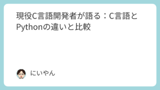 Python 現役C言語開発者が語る:C言語とPythonの違いと比較 私は、C言語を使用している現役組み込みシステムのエンジニアです。エンジニア歴は、10年以上です。最近Pythonを書くようになり、C言語との違いで「うーん」慣れへんなぁとなったところをまとめてみようと思います。慣れないことでPython使うのやーめよってなる方もいるかと思いますので、ぜひ参考にしてく... 2021.09.20 2025.02.06 Pythonプログラム技術