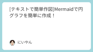 Mermaid [テキストで簡単作図]Mermaidで円グラフを簡単に作成! Mermaidで円グラフを簡単に作成する方法を解説!データの割合を視覚的に表現する円グラフの基本から、タイトルの追加、データ数の表示まで、具体的なコード例と共にわかりやすく説明します。 2024.11.12 2025.11.30 Mermaid技術